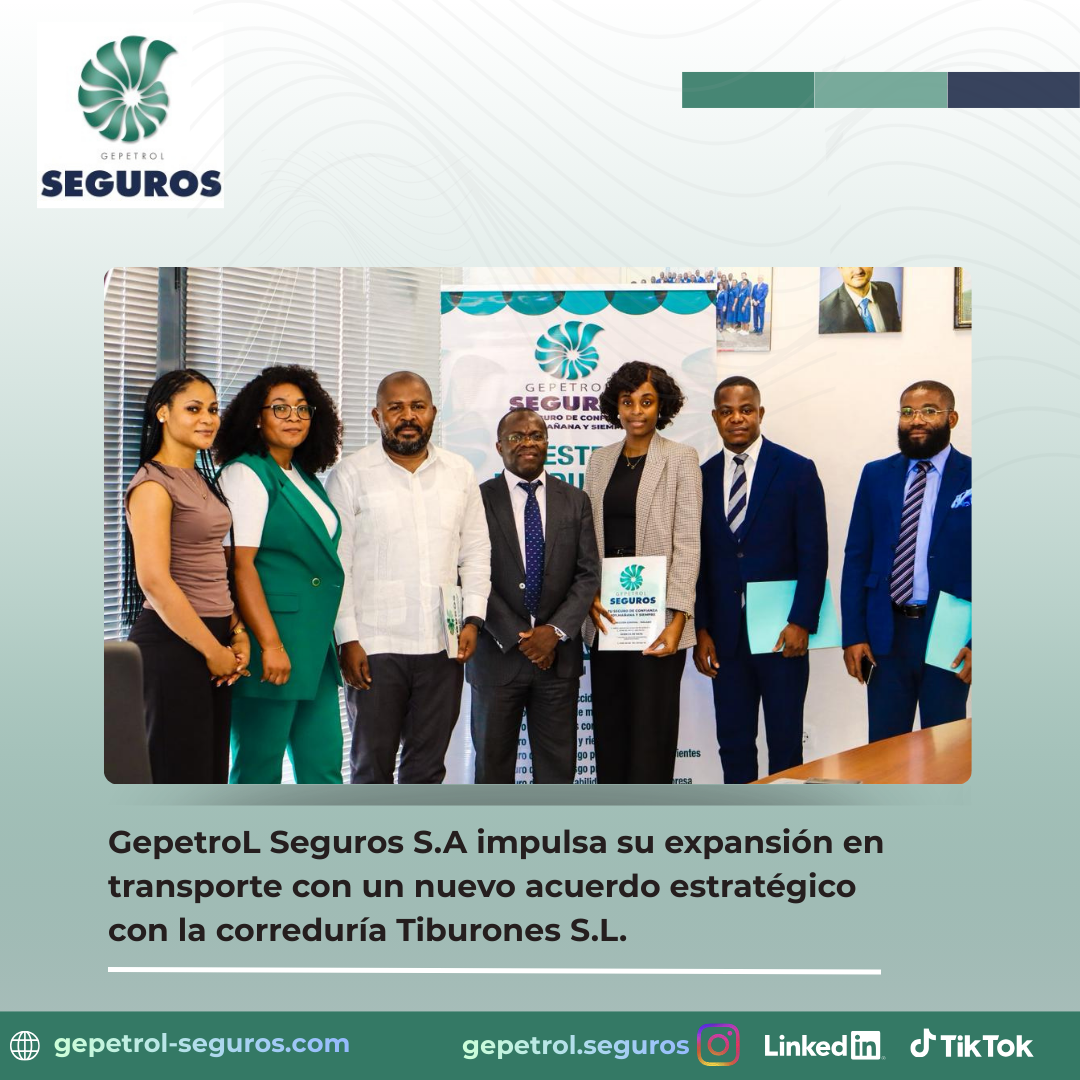 Hoy miércoles 18 de marzo, Gepetrol Seguros S.A. ha formalizado un importante acuerdo con la correduría Tiburones S.L., con el objetivo de ampliar su cartera de clientes y su posicionamiento estratégico en el sector del transporte. El encuentro, celebrado en las oficinas de la correduría, contó con la presencia del Director General de Gepetrol Seguros S.A., Crisantos Mesie Nsue, quien, acompañado del representante de Tiburones S.L., procedió a la firma del acuerdo. Tras la rúbrica, se realizó la fotografía oficial y el Director General destacó su confianza en la alianza, señalando que “espera que el acuerdo sea fructífero”. También participaron el Director Técnico, Teodoro Ngomo Nvo, y otros miembros del equipo.